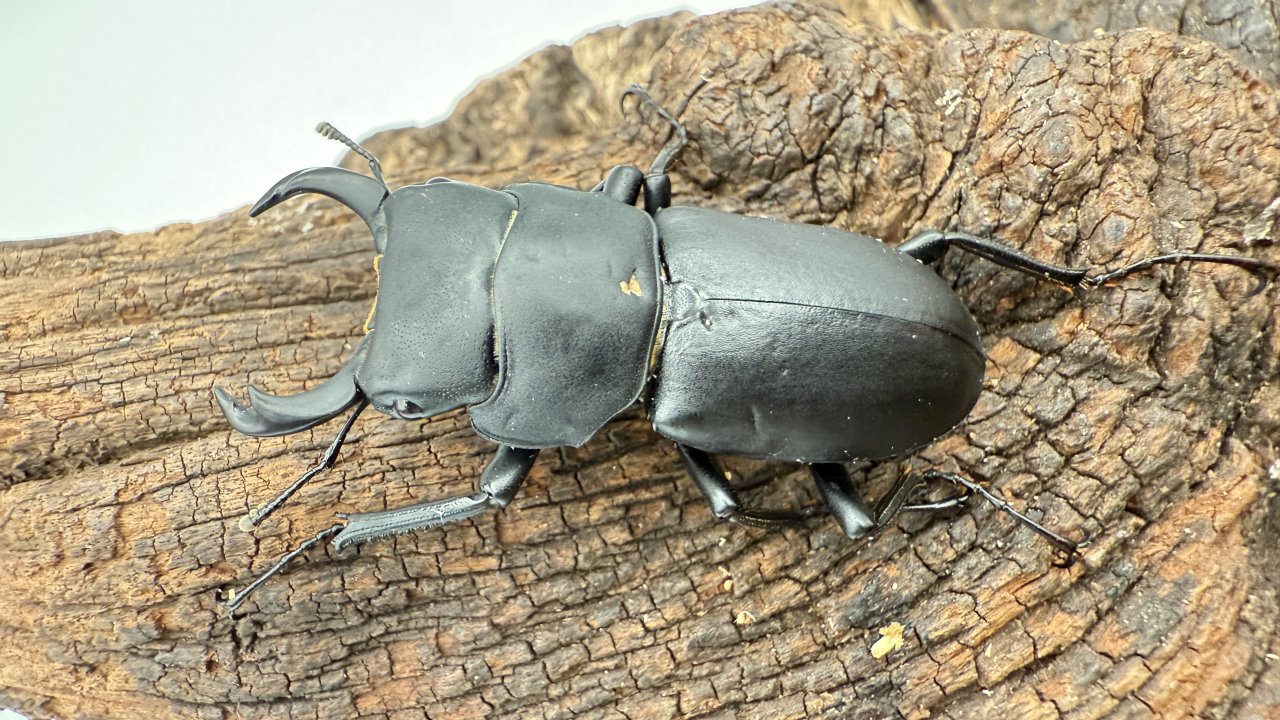 特徴として、全身黒色で弱い光沢があり、大アゴは短く、強く湾曲しています。大顎は大歯型のオオクワガタに似ていますが、オオクワよりも細いイメージ。