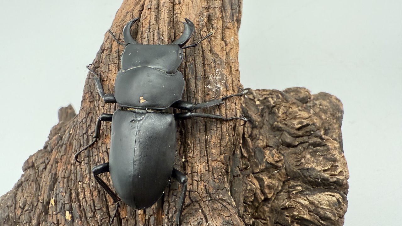 上翅は細かく密な点刻におおわれ、スジは無く、脚はオオクワに比べてずいぶんと長いイメージになります。