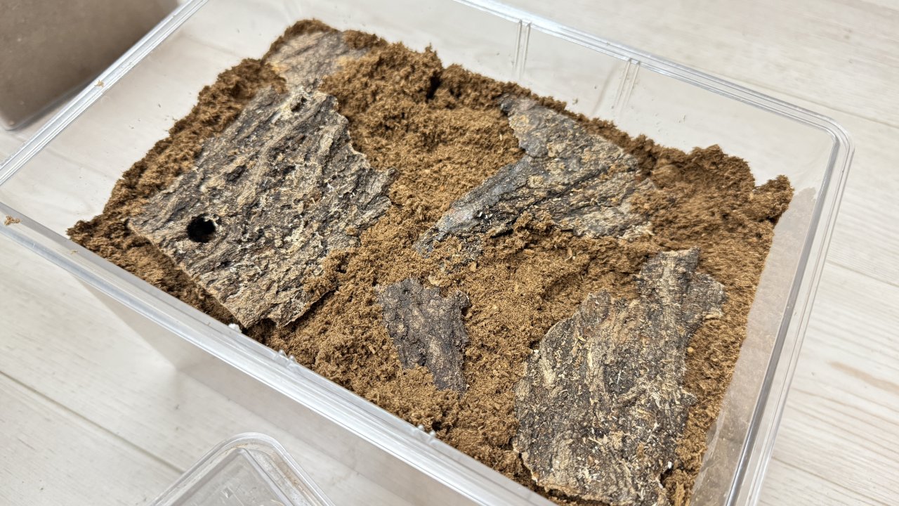 1)飼育ケースなどに♀が潜れない程度のマットを敷きます。