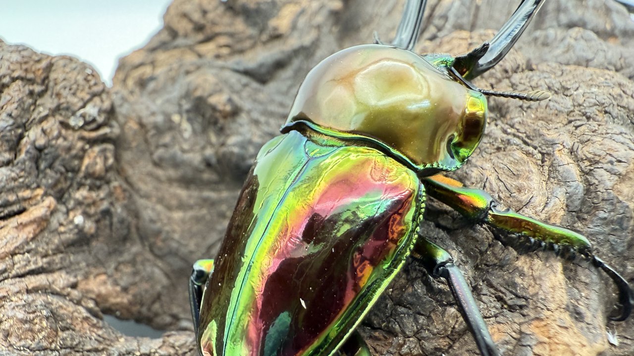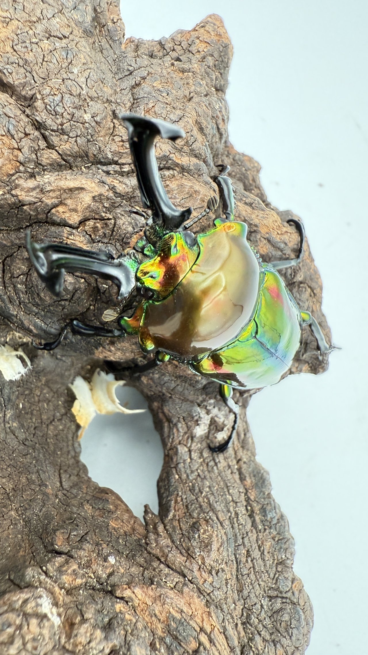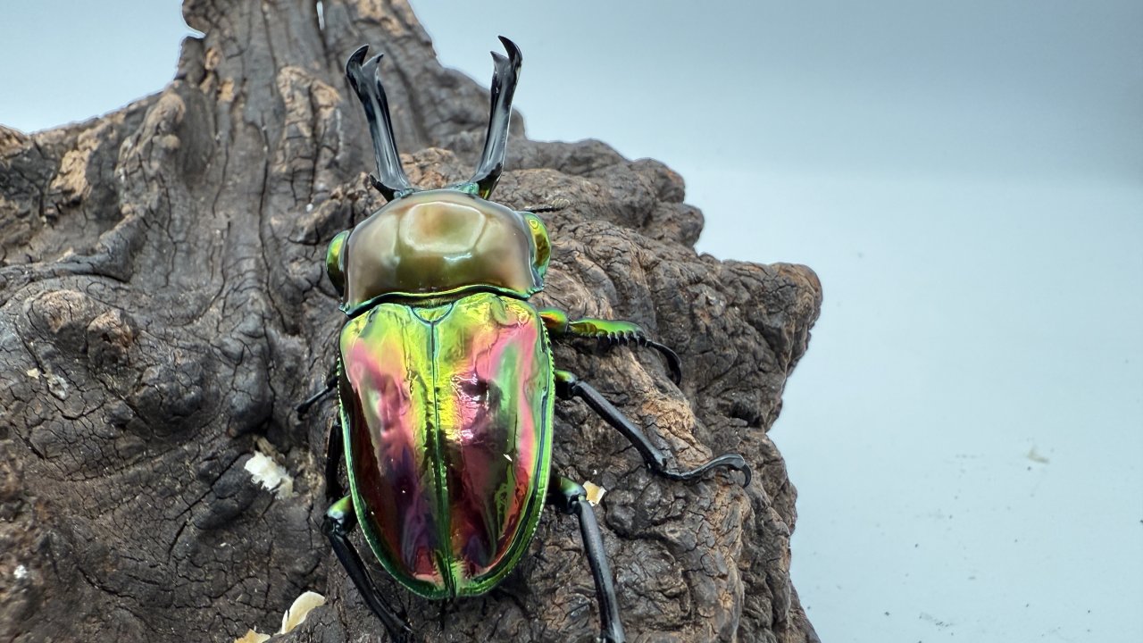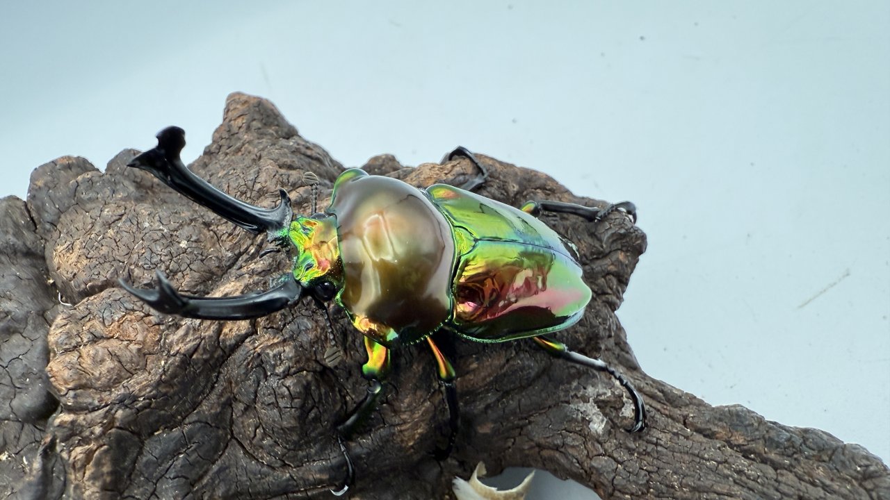 通常は、上翅(背中)部分に光沢があり、胸部(頭の部分)がマット(光沢の無いつや消し)になるのですが、この子は「ピカール」というRTN様が作出された血統の子です。胸部にも光沢が発生します。
