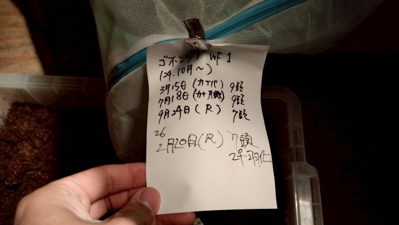 羽化後の管理では、飼育していることを忘れないよう湿度の管理はしっかりと、そしてできるだけ静かなところでに管理してください。光や振動のストレスが多いと、休眠が開ける前に☆になることも有りますので注意です。