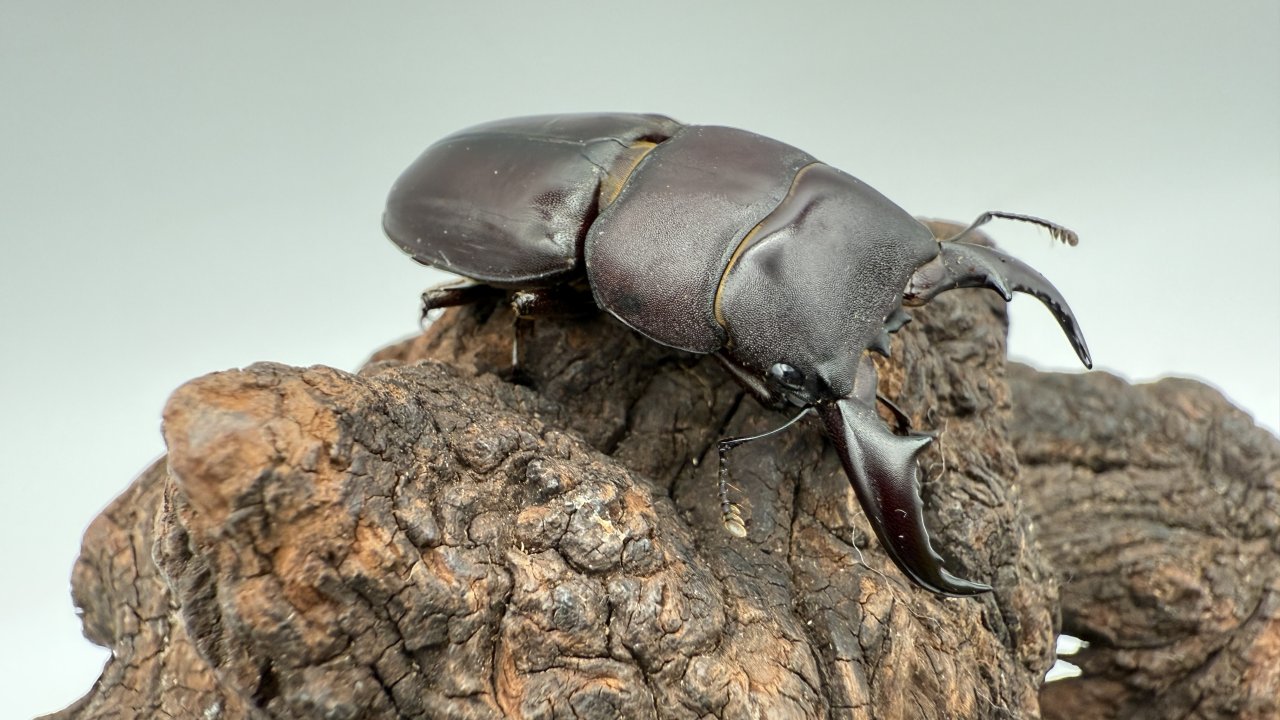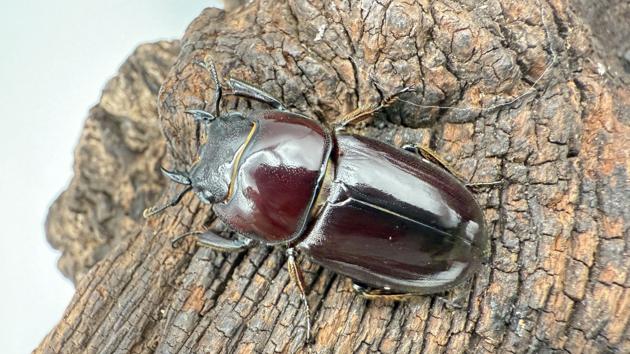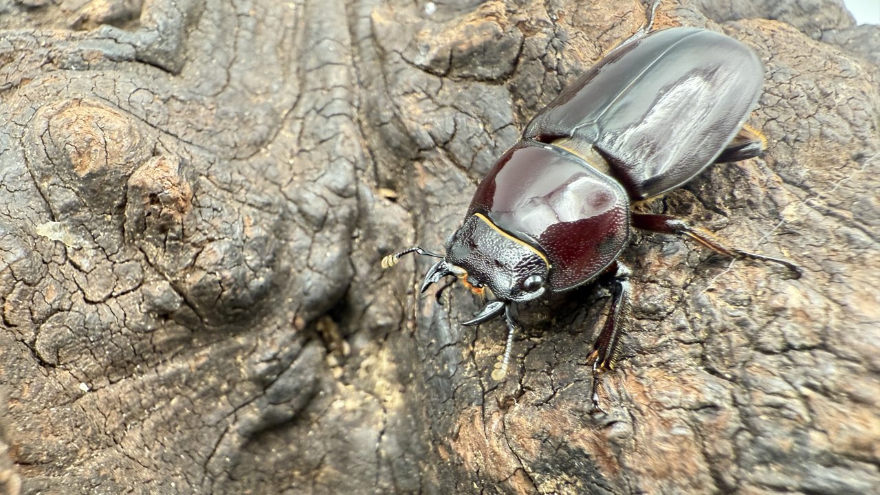 体色は赤みを帯びた黒。 室内灯の下では渋い黒に見えるのに、太陽光を浴びた瞬間、ワインレッドのような深い赤がふっと浮かび上がる。その変化に、思わず見入ってしまうヒラタです。