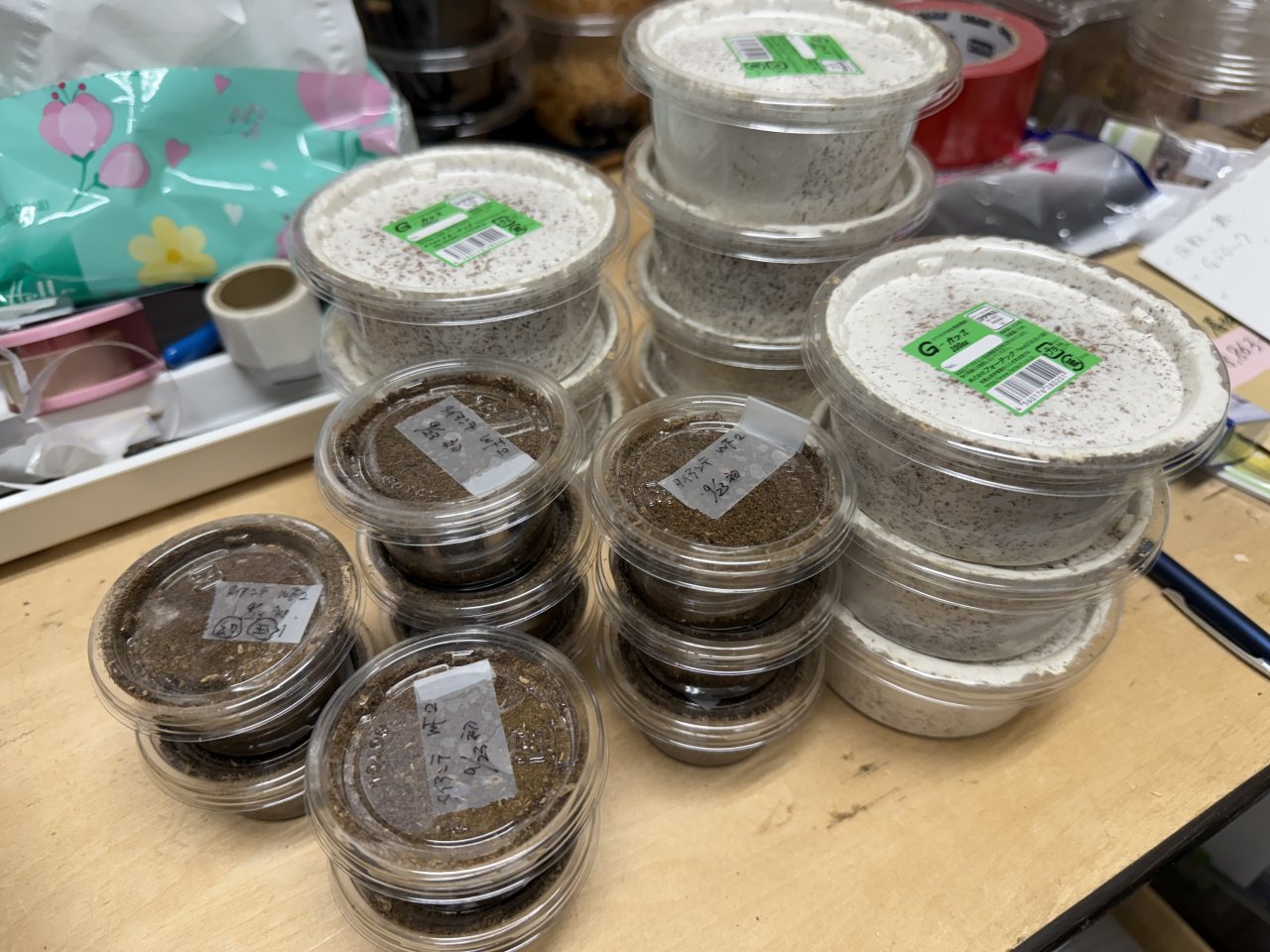 セット後は暗所にて保管し、ゼリー交換(週に一度位)のときのみ観察しましょう。材の樹皮は捨てずに六脚堂では転倒防止などに再利用しています。
