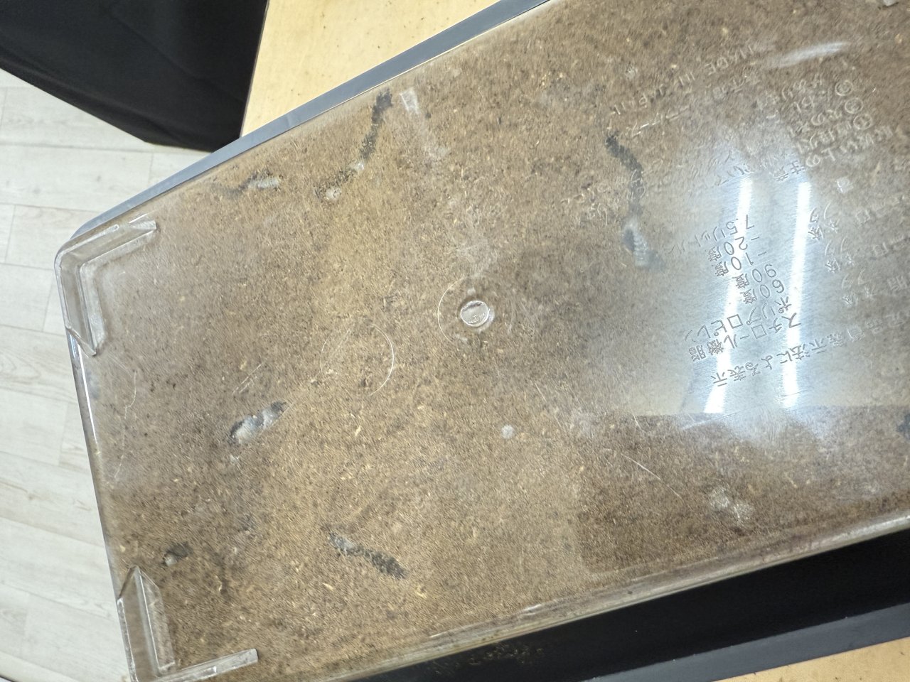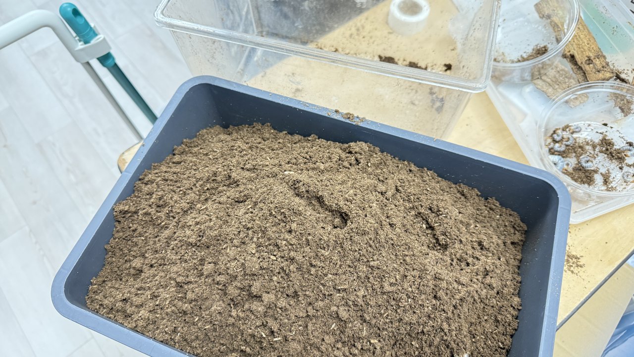 1)飼育ケースなどに♀が潜れない程度のマットを敷きます。