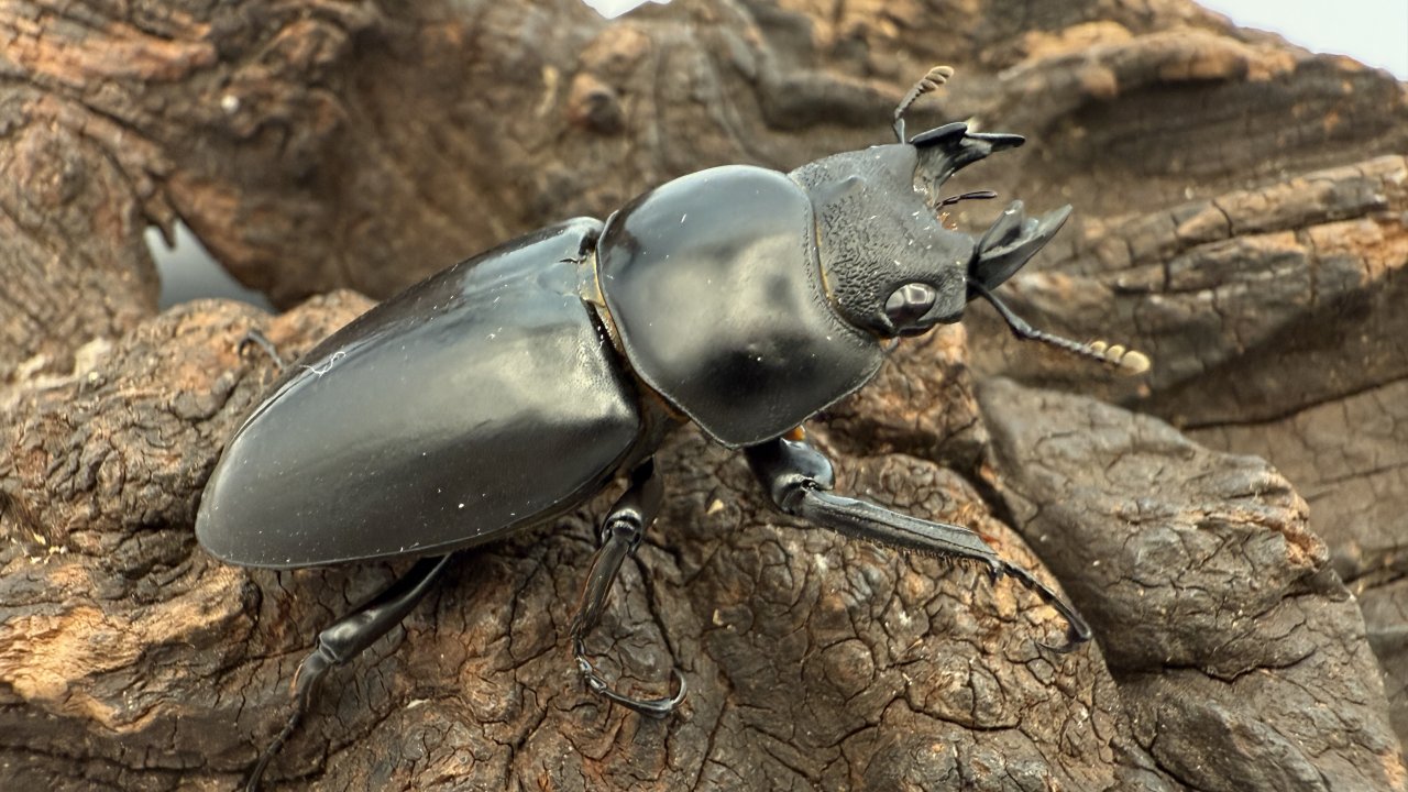 大あごはわりと細長く、前方に向かってゆるやかに湾曲しています。大型個体になると、先端が小さく二股に分かれます。